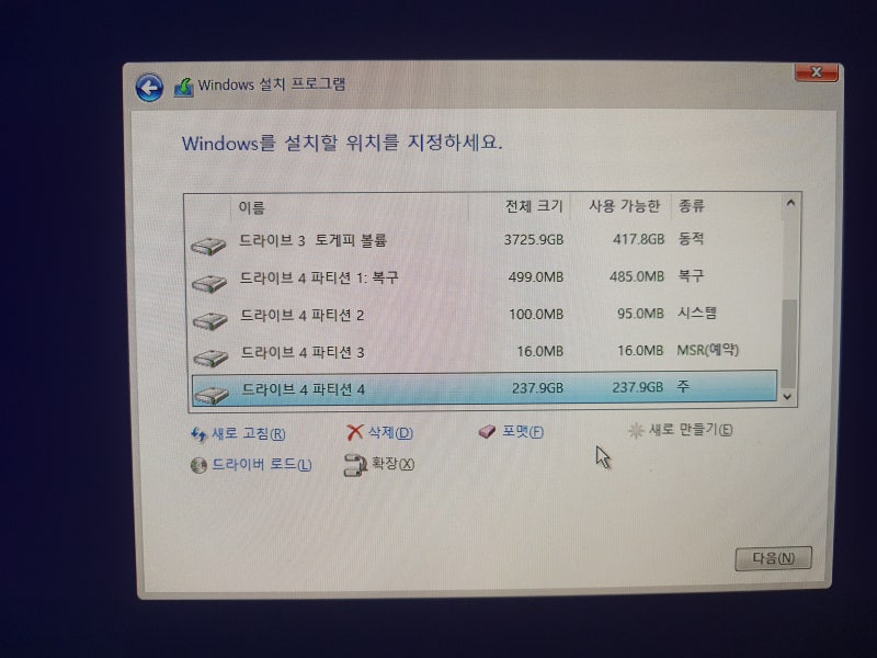 주 라고 되어있는 파티션 4를 선택 후 다음 을 눌러주세요.