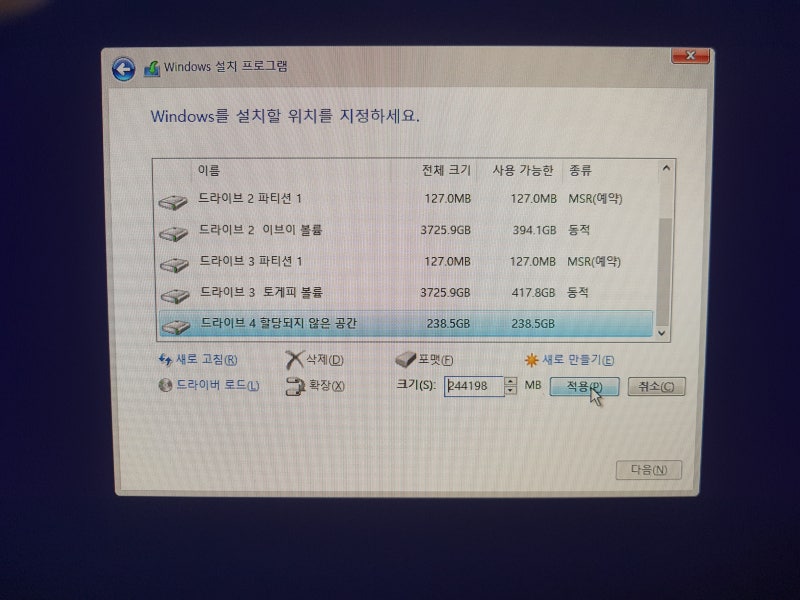 9. 여기부터 중요합니다. 새삥 SSD나 HDD에 설치하면 별 어려움이 없는데.. 그게 아니면 조금 복잡할 수 있습니다.