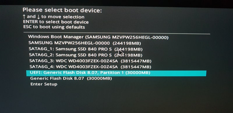 * 혹시 이거 선택해서 안되면 'UEFI :'뒤에 써있는 애와 이름이 같은 애가 있습니다. UEFI 가 안붙은 USB로 설치를 해봅시다.